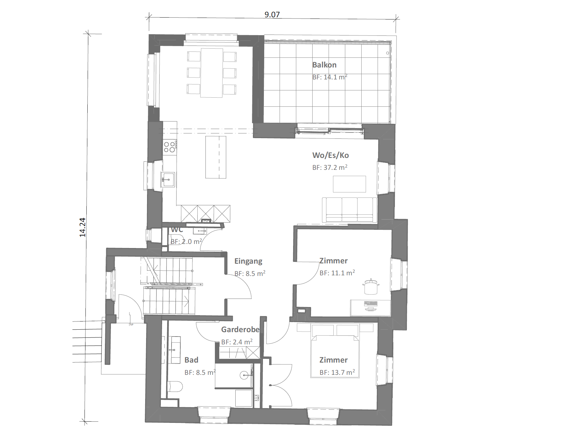 Diese Wohnung besticht durch den grosszügigen Grundriss, die gekonnt in Szene gesetzten Jugendstil-Elemente aus dem Baujahr, die sehr geräumige offene Küche mit grosser Arbeitsfläche und viel Stauraum, das moderne Badezimmer sowie die zusätzliche Gästetoilette, helle Parkett-Böden, den Aussenbereich mit gedecktem Balkon sowie einen zusätzlichen Sitzplatz.