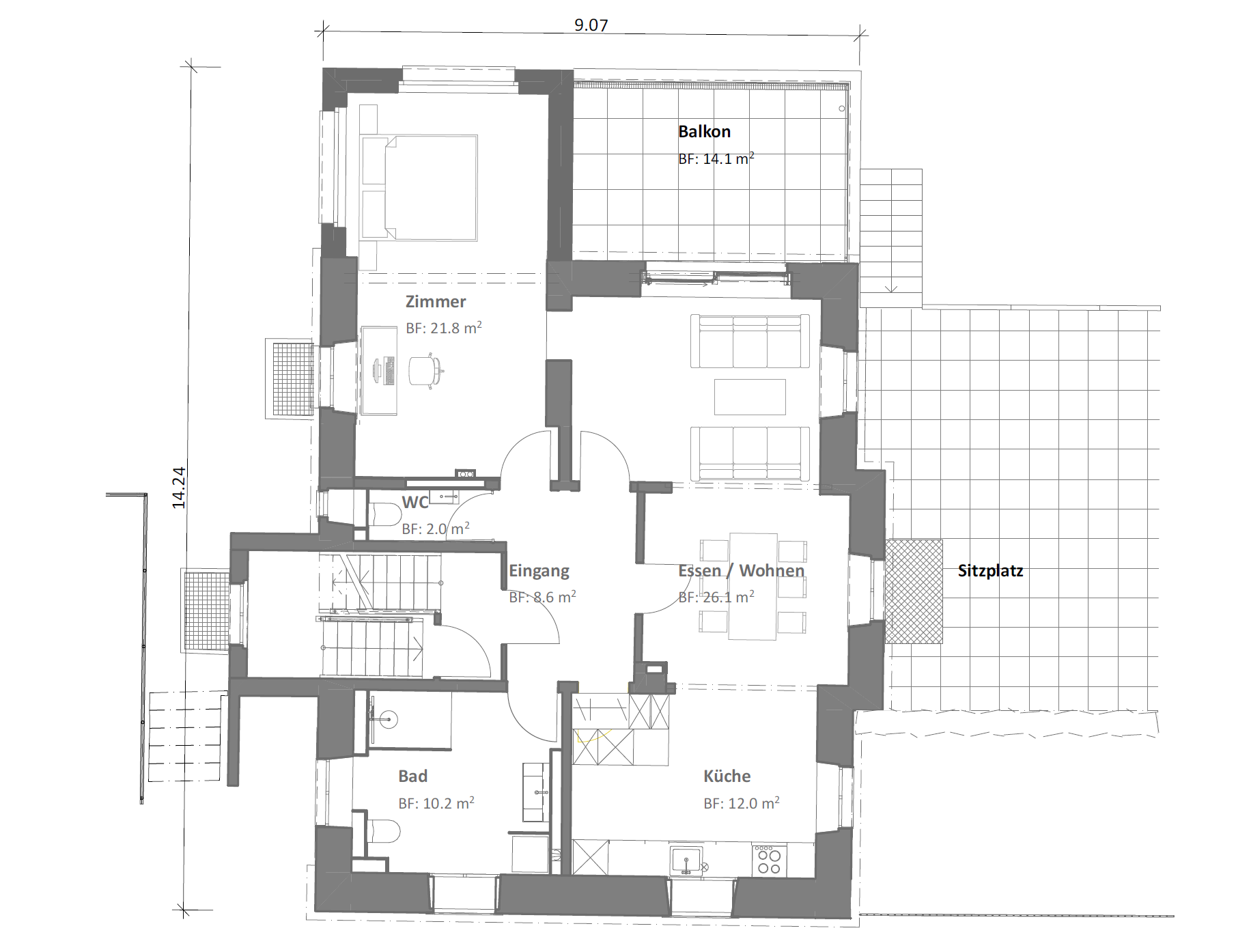 3-Zimmer-Wohnung im Erd-/Untergeschoss mit 80.7 m2 Wohnfläche, Balkon und grossem Sitzplatz sowie Keller im Untergeschoss
